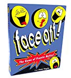 HIGHEST RATING FROM BOARD GAME GEEK: “Face Off! is a totally crazy game that we recommend to any players looking to stretch the bounds of game play in the direction of a barely controlled riot. We give it Five Smilies [highest rating].” The funniest, wackiest game you’ll ever play! Use zany trading signals–from crazy faces to wild animal sounds, and more!–to communicate with fellow players. Trade cards with anyone signaling the same sign back to you. There’s no taking turns, so the action is frantic! Be first to collect 9 matching cards, and you’ll win the hand… plus you’ll get to choose the wild signal set for the next round of play! Using the facial trading set? Then you’ll… Signal “1” by sticking out your tongue! Signal “2” by bulging open both eyes! Signal “3” by opening eyes and mouth wide! Easy to learn and hilarious to play, Face Off!TM is outrageous fun for 3-9 players, ages 7 to adult. Includes 108 brightly colored cards: 9 sets of “gem cards”; 4 sets of “trading signal” cards, with hilarious facial expressions, wild animal sounds and crazy actions, and more! Comes with clear and simple instructions. Hours of hilarious family fun!
