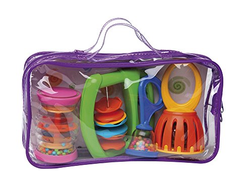 Creative Child Magazine Top Toy of the Year award. Your child will love shaking and rocking with the Baby Band. Helps develop gross motor skills plus other early stage developmental benefits. All items thoroughly safety tested and approved for children 3 months and up. 4- piece set includes a mini tube shaker, baby maraca, baby rattle, and cage bell. Vinyl bag provides a sturdy carrying case. County of origin Israel.